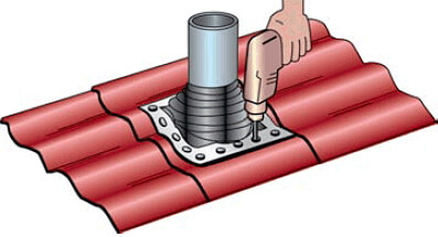 Кровельный материал расчерчивается по лекалу и вырезается необходимое число отверстий. Вентиляционный выход фиксируется саморезами к кровле без использования герметика. Основной вентиляционный выход устанавливается соответственно уровню воздуховода.